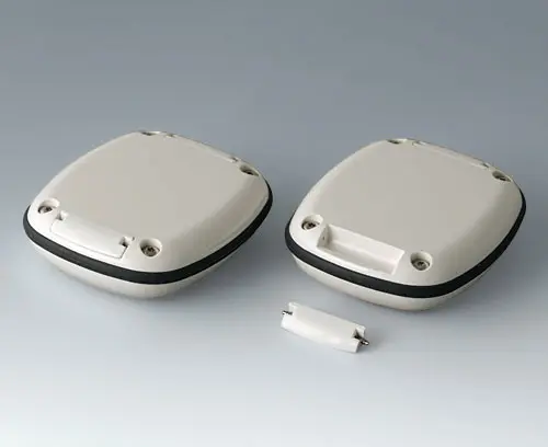 Modern small enclosure specifically designed for "wearable technologies". Three-part design consisting of highly polished top and bottom parts and a matt TPV sealing ring.