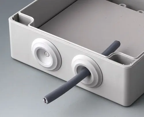 Simple cable grommet, easy to install, with easy-to-pierce membrane. Tight fit as soon as the cable is pulled backwards a little. Free of halogens. Suitable for wall thicknesses from 0.5 - 3 mm and for cable diameters from 6 - 13 mm. Operating temperatures from -40°C to +100°C. Borehole ø 20.5 mm.
