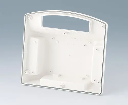 CARRYTEC S Particularly robust plastic enclosure with handle for outdoor use. Recessed surface for membrane keyboards. Flat, impact-protected areas on the bottom part of the enclosure for installing interfaces, plug-in connectors, peripheral equipment etc. Interface installation at the rear, e.g. support arm applications, ensures orderly cable routing through enclosure connection. Attachment domes for PCBs and components in the top and bottom parts. Stations for easy transmission of data and charging current, as well as battery compartment 5 x AA (processing on request) as an accessory.