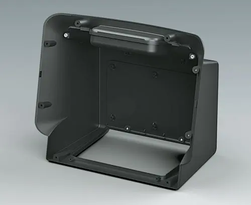Order with COMMUNITEC S basic housing. Features a recessed area for protecting membrane keypads and integrating large-format displays up to 11.5" (29 cm), with a flat area below for front-mounted control elements and connectors. Includes integrated fastening pillars for PCBs or mounting plates. The operating panel is installed from the rear.