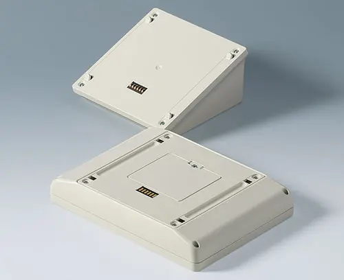 Bottom part S flat, version I Assembly unit: unique variety of applications -mobile / desk-top and wall mounted. With screw pillars for PCB fixing. End piece for bottom part required - depending on the application - battery compartment and lid / bottom panel with handle recess / bottom panel with snap-in strips, base (desk-top), base (station for mobile cases) or base (desk-top/wall) can be assembled - see separate articles.