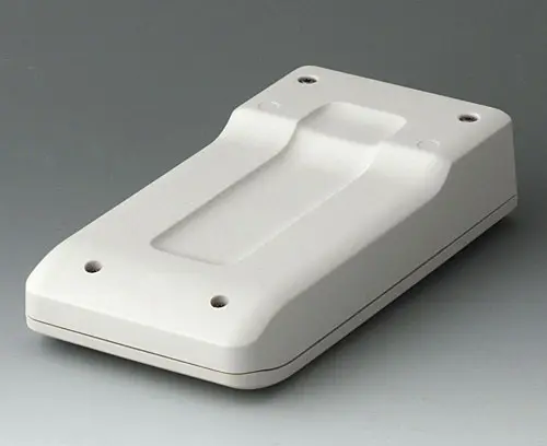 2-part compact hand-held enclosure with an ergonomic, robust design. Secure grip through finger recess in the bottom part. Recessed user area to protect the operating elements. Attachment domes for PCBs and components in the top and bottom parts.