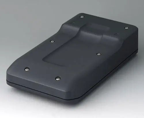 2-part compact hand-held enclosure with an ergonomic, robust design. Secure grip through finger recess in the bottom part. Recessed user area to protect the operating elements. Attachment domes for PCBs and components in the top and bottom parts.