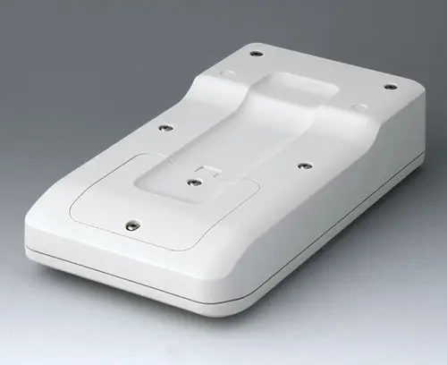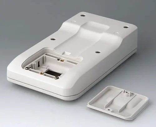3-part compact hand-held enclosure with sealing and with an ergonomic, robust design. Ideal for miniaturised electronics applications. Secure grip through finger recess in the bottom part and centre of gravity near the body. With a battery compartment, accessible from the outside, for 3 x 1.5 V AA batteries. Recessed user area to protect the operating elements. Attachment domes for PCBs and components in the top and bottom parts.