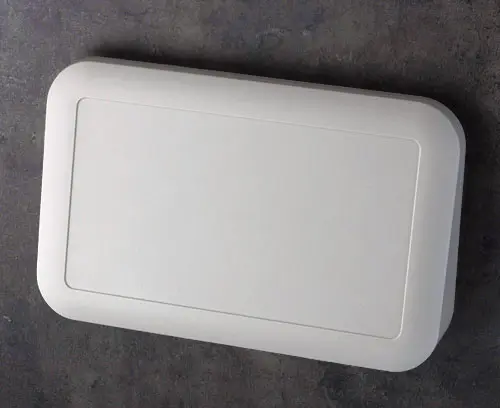 2-part plastic enclosure with operating panel ergonomically inclined by 12°. Top part with recessed area for protecting a membrane keypad or decor foil. Robust design. Case assembled with Torx drive stainless steel screws. Seal for protection class IP 65 available as an accessory. Fastening pillars for PCBs and components in the top and bottom parts. Wall suspension element ordered separately.
