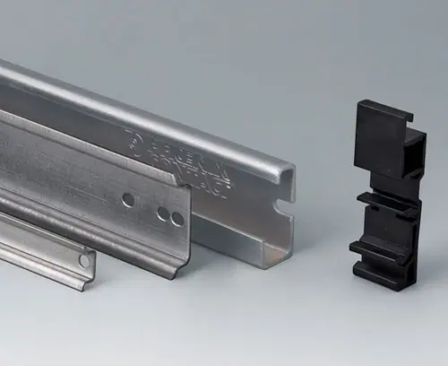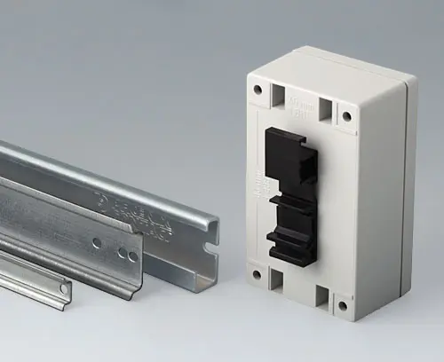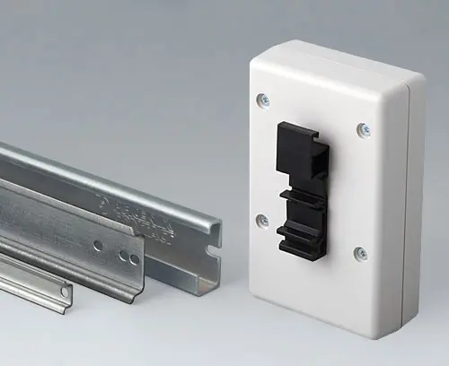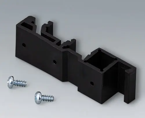 Universal suspension element suitable for small plastic enclosures. Suitable for DIN EN 60715 (TH35, TH15 and G32). 2 screws for case assembly for wall thickness 3 mm. Locating holes see drawing.