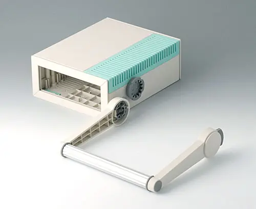 MEDITEC E 220, without handle bar Complete case. Ideally suited to accommodate single-Eurocards 100 x 220 mm or 100 x 160 mm. Two identical shells are joined together so that they overlap. Side trims easily fitted. Non-slipping case feet are fixed by screws to ensure a firm and stable support.