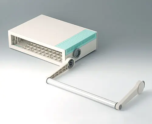 MEDITEC D 220, without handle bar Complete case. Ideally suited to accommodate double-Eurocards 233.4 x 220 mm. Two identical shells are joined together so that they overlap. Side trims easily fitted. Non-slipping case feet are fixed by screws to ensure a firm and stable support.