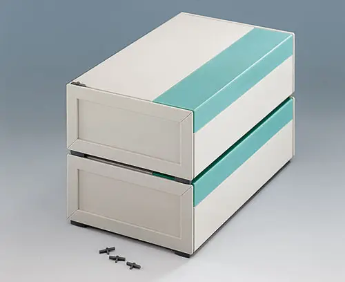 MEDITEC E 220, without handle bar Complete case. Ideally suited to accommodate single-Eurocards 100 x 220 mm or 100 x 160 mm. Two identical shells are joined together so that they overlap. Side trims easily fitted. Non-slipping case feet are fixed by screws to ensure a firm and stable support.