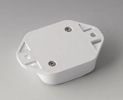 2-part plastic enclosure with flat top part. Bottom part with integrated flanges for fast wall mounting or for mounting on rails and tube profiles or on masts. Robust design with proven tongue and groove connection. Assembled with Torx stainless steel screws. Fixing supports for PCBs and components in the top and bottom parts. Fastening on the supports is by means of hot caulking.