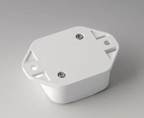 2-part plastic enclosure with high top part. Bottom part with integrated flanges for fast wall mounting or for mounting on rails and tube profiles or on masts. Robust design with proven tongue and groove connection. Assembled with Torx stainless steel screws. Fixing supports for PCBs and components in the top and bottom parts. Fastening on the supports is by means of hot caulking.