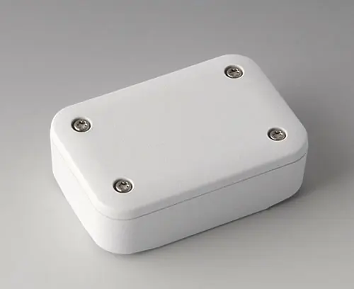 2-part plastic enclosure with high top part, for universal use. Robust design with proven tongue and groove connection. Assembled with Torx stainless steel screws. Fixing supports for PCBs and components in the top and bottom parts. Fastening on the supports is by means of hot caulking.