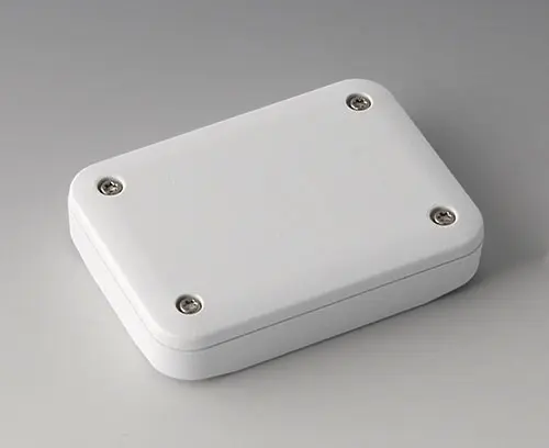 2-part plastic enclosure with flat top part, for universal use. Robust design with proven tongue and groove connection. Assembled with Torx stainless steel screws. Fixing supports for PCBs and components in the top and bottom parts. Fastening on the supports is by means of hot caulking.