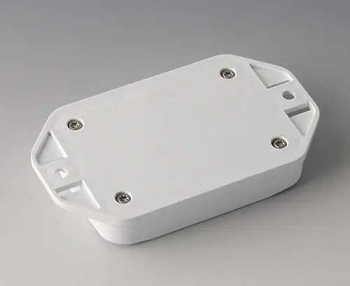 2-part plastic enclosure with flat top part. Bottom part with integrated flanges for fast wall mounting or for mounting on rails and tube profiles or on masts. Robust design with proven tongue and groove connection. Assembled with Torx stainless steel screws. Fixing supports for PCBs and components in the top and bottom parts. Fastening on the supports is by means of hot caulking.