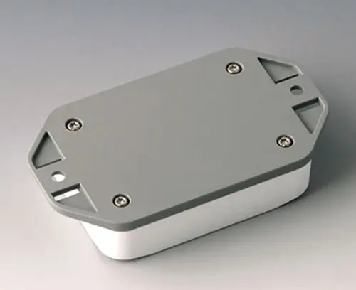 2-part plastic enclosure with high top part. Bottom part with integrated flanges for fast wall mounting or for mounting on rails and tube profiles or on masts. Robust design with proven tongue and groove connection. Assembled with Torx stainless steel screws. Fixing supports for PCBs and components in the top and bottom parts. Fastening on the supports is by means of hot caulking.