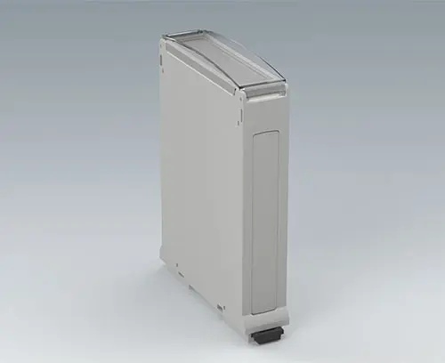 RAILTEC BP, M22, with closed side panels DIN rail enclosure with pluggable side panels and front panel. Connection options on three sides. For plug headers max. 2 x 16-pin, 5.08, fixed or pluggable. Simple and quick assembly by locking onto DIN rails EN 60715 TH35. The panel version provides simple and flexible installation of the electronics as well as efficient, screwless case assembly.