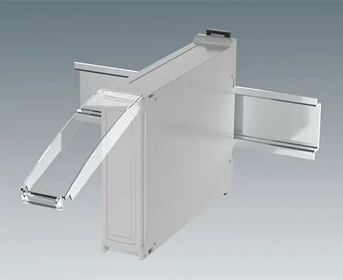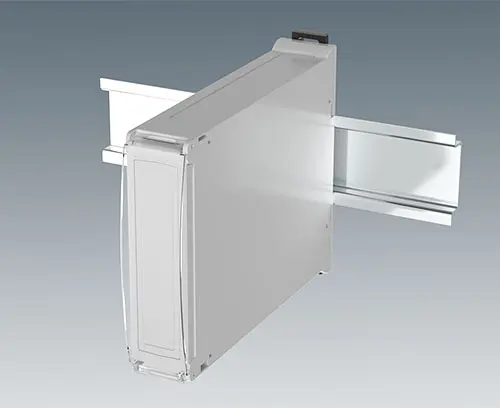 RAILTEC BP, M22, with ventilation slots DIN rail enclosure with 2 pluggable side panels with ventilation slots for increased heat dissipation and front panel. Simple and quick assembly by locking onto DIN rails EN 60715 TH35. The panel version provides simple and flexible installation of the electronics as well as efficient, screwless case assembly.