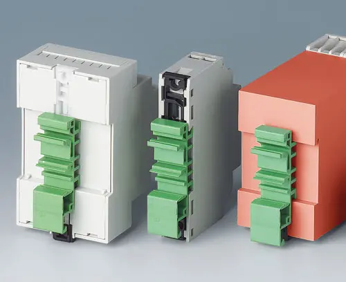RAILTEC C, 1 module, Vers. III Enclosure with 2 sides open for connection. Fast and simple locking capability onto DIN EN 60715 (TH35). Vertical and horizontal guides for assembling the PCBs. Easy assembly through snap-in installation of the case parts. Front panel see accessories.