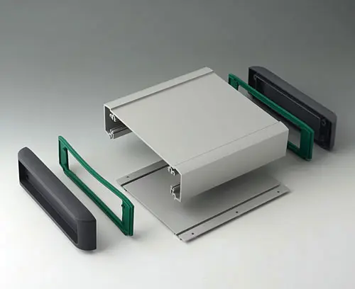 Horizontal guides and screw channels provided inside the case for fitting PCBs. Flat areas for easy installation of interfaces. Recessed area in the top for the protection of displays, membrane keypads and operating elements. Side covers with recessed area for protecting cables and connectors.
