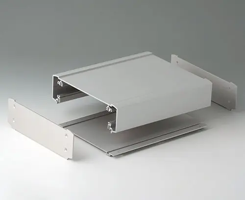 Horizontal guides and screw channels provided inside the case for fitting PCBs. Flat areas for easy installation of interfaces. Recessed area in the top for the protection of displays, membrane keypads and operating elements.