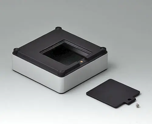 4-part enclosure for many different applications. Sturdy frame made of aluminium, glass bead-blasted and anodised. Plastic parts made of ASA+PC-FR with good UV resistance and high flame resistance. Attachment domes for PCBs and components in the top and bottom parts. Top part with recessed surface to protect the membrane keyboard. Bottom part with opening and screw-down cover: practical for the use of a battery compartment or for access to the interior, e.g. for a memory card or batteries that are mounted directly on the PCB. Battery compartment kit 4 x AA with contact springs, battery clips, button cell holder and wall mounting option as accessories.