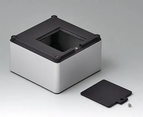 4-part enclosure for many different applications. Sturdy frame made of aluminium, glass bead-blasted and anodised. Plastic parts made of ASA+PC-FR with good UV resistance and high flame resistance. Attachment domes for PCBs and components in the top and bottom parts. Top part with recessed surface to protect the membrane keyboard. Bottom part with opening and screw-down cover: practical for the use of a battery compartment or for access to the interior, e.g. for a memory card or batteries that are mounted directly on the PCB. Battery compartment kit 4 x AA with contact springs, battery clips, button cell holder and wall mounting option as accessories.
