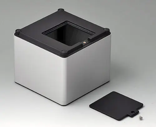 4-part enclosure for many different applications. Sturdy frame made of aluminium, glass bead-blasted and anodised. Plastic parts made of ASA+PC-FR with good UV resistance and high flame resistance. Attachment domes for PCBs and components in the top and bottom parts. Top part with recessed surface to protect the membrane keyboard. Bottom part with opening and screw-down cover: practical for the use of a battery compartment or for access to the interior, e.g. for a memory card or batteries that are mounted directly on the PCB. Battery compartment kit 4 x AA with contact springs, battery clips, button cell holder and wall mounting option as accessories.