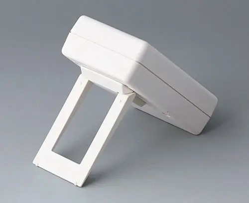 HAND-HELD-BOX P, Vers. II Successfully used case for measuring instruments. With recessed area for imprintings or your logo. Cut-out section for LCD or analogical modules. With battery compartment, accessible from the outside, for 9 V flat battery (PP3) or 1.5 V baby cell (C) with contacts for soldering. Raised front area to accommodate plugs.