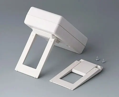 HAND-HELD-BOX M, Vers. I Small hand-held case with excellent design. With recessed area, e.g. for membrane keyboards, control elements. Cut-out section for digital and analogical modules. Battery compartment accessible from the outside with locked battery compartment lid. Raised front area to accommodate plugs.