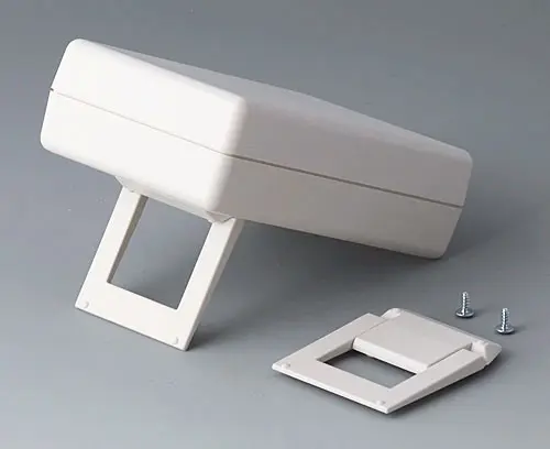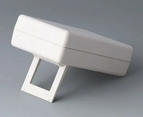 HAND-HELD-BOX P, Vers. II Successfully used case for measuring instruments. With recessed area for imprintings or your logo. Cut-out section for LCD or analogical modules. With battery compartment, accessible from the outside, for 9 V flat battery (PP3) or 1.5 V baby cell (C) with contacts for soldering. Raised front area to accommodate plugs.
