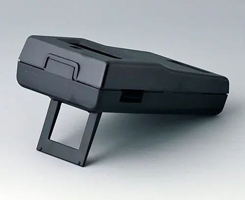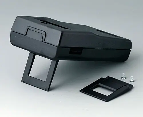 HAND-HELD-BOX M, Vers. I Small hand-held case with excellent design. With recessed area, e.g. for membrane keyboards, control elements. Cut-out section for digital and analogical modules. Battery compartment accessible from the outside with locked battery compartment lid. Raised front area to accommodate plugs.